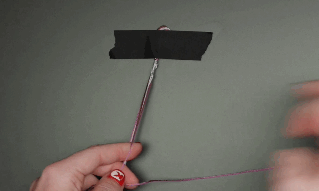When only one string is left on each side, tie the two center strings together using whichever knots you like. Now you’re ready to begin your bracelet pattern.